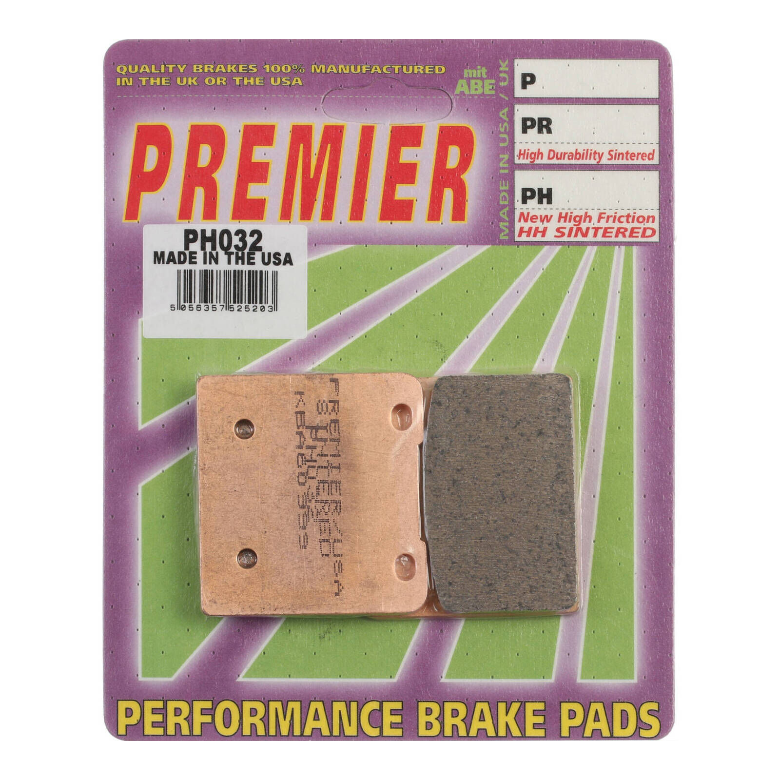 High-performance HH friction rated sintered metal pads made in the USA to an exclusive Premier formulation. PH brake pads offer maximum durability and unbeatable performance under heavy braking and high-speed use. PH series is no longer available for off-road applications following the formulation improvements of the PR range for Moto-X and ATV applications.