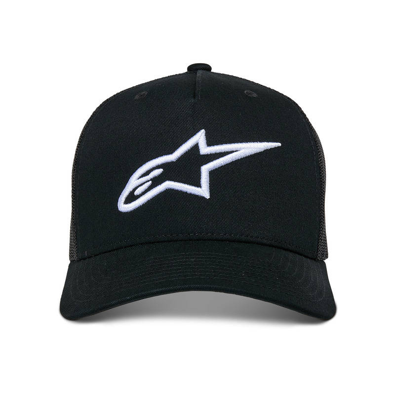 Curved bill trucker cap with mesh back and 3D embroidered front logo.
