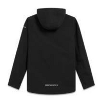 Built for wet weather, this rain shell jacket features a water-resistant 2.5-layer fabric and fully taped seams for reliable protection. Designed with a fixed hood and pre-curved sleeves for comfort and mobility, it includes a coated reverse coil front zipper and secure zippered hand pockets. Bungie adjusters at the hood and hem, plus Velcro cuff tabs, allow for a customizable fit. Finished with subtle logo branding at the chest and left sleeve, as well as internal and external label details, this shell blends performance with clean design.