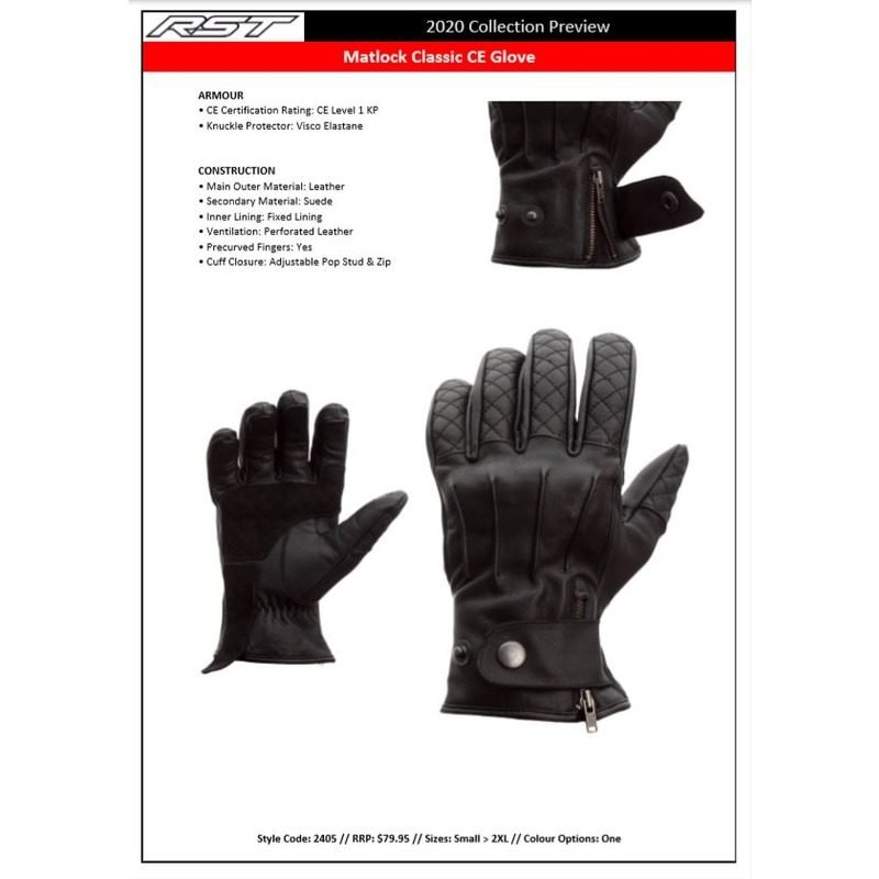 The Matlock is a classic motorcycle glove, ideally worn with the RST Matlock leather jacket. CE certified to Level 1 KP, the glove features Visco Elastane knuckle protectors. Additionally, it has a vintage style and the same quilted detailing on the jacket. Made from leather with suede in key impact areas, the glove has perforated leather for added ventilation while riding.