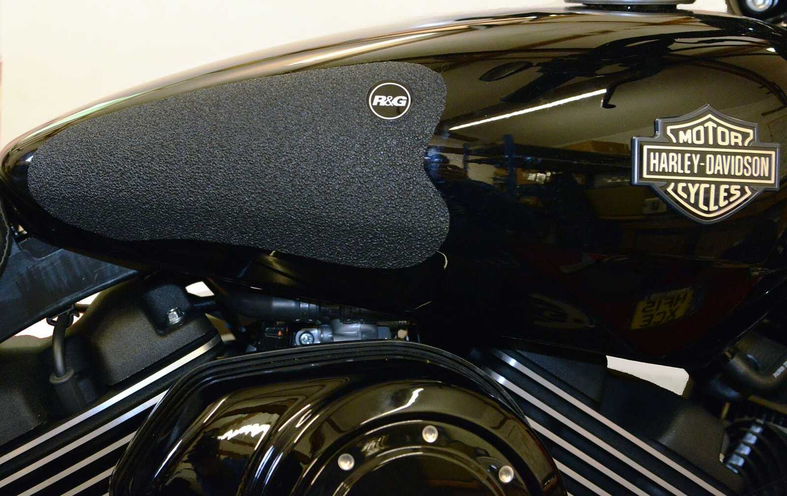 R&G Tank Traction Grip kits are available for many different bike styles and brands, with new applications released regularly. The unique R&G Tank Traction Grip texture was specifically designed to be both soft and durable, providing the rider with the grip and feel he/she needs to assist in better bike control, enabling the rider to maintain a stable body position while cornering and braking, whilst also relieving fatigue and providing the rider with complete confidence allowing him/her to fully focus on the road (or track) ahead instead of slipping and sliding on the tank. Each Tank Traction Grip kit is supplied with precision pre-cut adhesive pieces, designed to fit the intended bike, typically in either 2, 4 or 6 pieces (in total) depending on the shape of the tank and adjoining fairing. The high-strength adhesive backing ensures a highly durable product that will stay exactly where you put it, as well as not affecting or damaging paintwork. Each R&G Tank Traction Grip kit is available in black and ultra-clear finishes to blend into your bike's paintwork or stand out, depending on your preference. R&G Eazi-Grip™ works in both wet and dry conditions and is equally at home on the track as it is on the commute home!Please note: R&G Tank Traction Grips now come with a 25mm diameter stick on emblem. This 2 piece Tank Traction Grip has been specially designed for the Harley Davidson Street 750/500 models. Made in the UK.