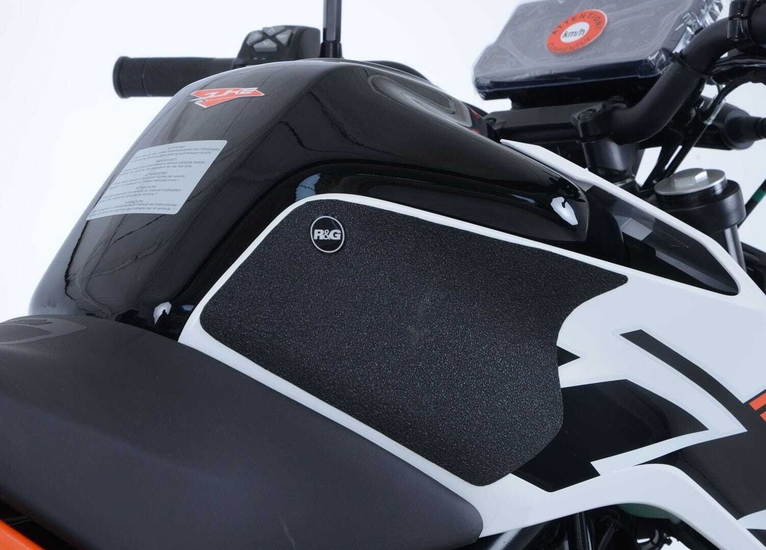 R&G Tank Traction Grip kits are available for many different bike styles and brands, with new applications released regularly.The unique R&G texture was specifically designed to be both soft and durable, providing the rider with the grip and feel he/she needs to assist in better bike control, enabling the rider to maintain a stable body position while cornering and braking, whilst also relieving fatigue and providing the rider with complete confidence allowing him/her to fully focus on the road (or track) ahead instead of slipping and sliding on the tank. Each Tank Traction Grip kit is supplied with precision pre-cut adhesive pieces, designed to fit the intended bike, typically in either 2, 4 or 6 pieces (in total) depending on the shape of the tank and adjoining fairing. The high-strength adhesive backing ensures a highly durable product that will stay exactly where you put it, as well as not affecting or damaging paintwork. Each R&G Tank Traction Grip kit is available in black and ultra-clear finishes to blend into your bike's paintwork or stand out, depending on your preference. R&G Tank Traction Grips work in both wet and dry conditions and is equally at home on the track as it is on the commute home!These R&G Tank Traction Grips have been specially designed for the KTM 125 DUKE '17-. Made in the UK.