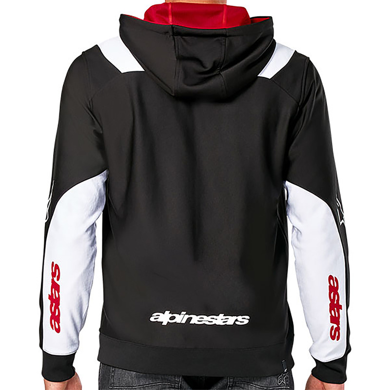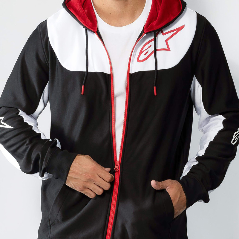 Zip-front poly fleece hoodie featuring bold Alpinestars branding and mesh-lined hood.