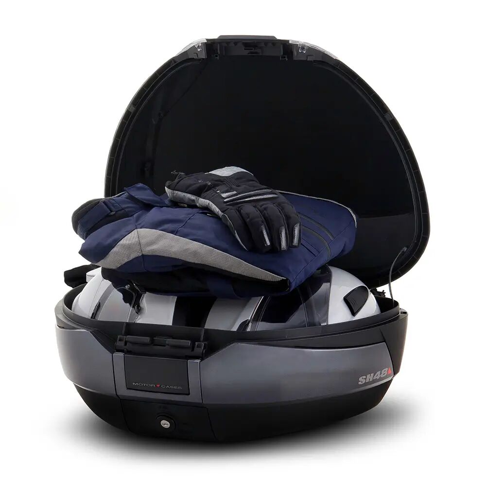 The SH48 DARK GREY is a high-end top case designed in Barcelona that fulfils all the market's requirements and offers maximum performance. With a capacity to hold two flip-up helmets. Weighing 3.7kg, it is the lightest high-capacity top case in the market. It offers maximum security thanks to its innovative hermetic Premium Smart Lock®. The case has a capacity for 2 full-face helmets and includes the Smart Lock System, an innovative system with an automatic retractable handle and a hermetic lock in 3 positions. It features dark grey side sashes and allows for one-hand opening. With one turn of the key, it simultaneously locks the access to the inside of the case and secures it to the motorcycle. A set of 2 keys is included. The case incorporates a durable rubber seal to improve closure and protect the interior against water and dust. It also includes an inner elastic cargo strap to ensure the load does not move. A Shad mounting plate with screw set and luggage-rack clips is included; however, most motorcycles require a specific SHAD Top Master fitting kit for installation. The size of the case is 46/61/31cm with a maximum recommended load of 8 kg. Optional accessories include a double high-quality polyurethane cushioned backrest (D0RI4800) for passenger comfort, an inner bag (X0IB00), a brake light (D0B29KL), an upper rack (D0PS00), and colourful covers.