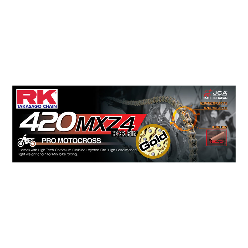• RK's MXZ chain features chromoly steel construction with seamless rollers and bushings, and oversized special alloy pins for added strength.