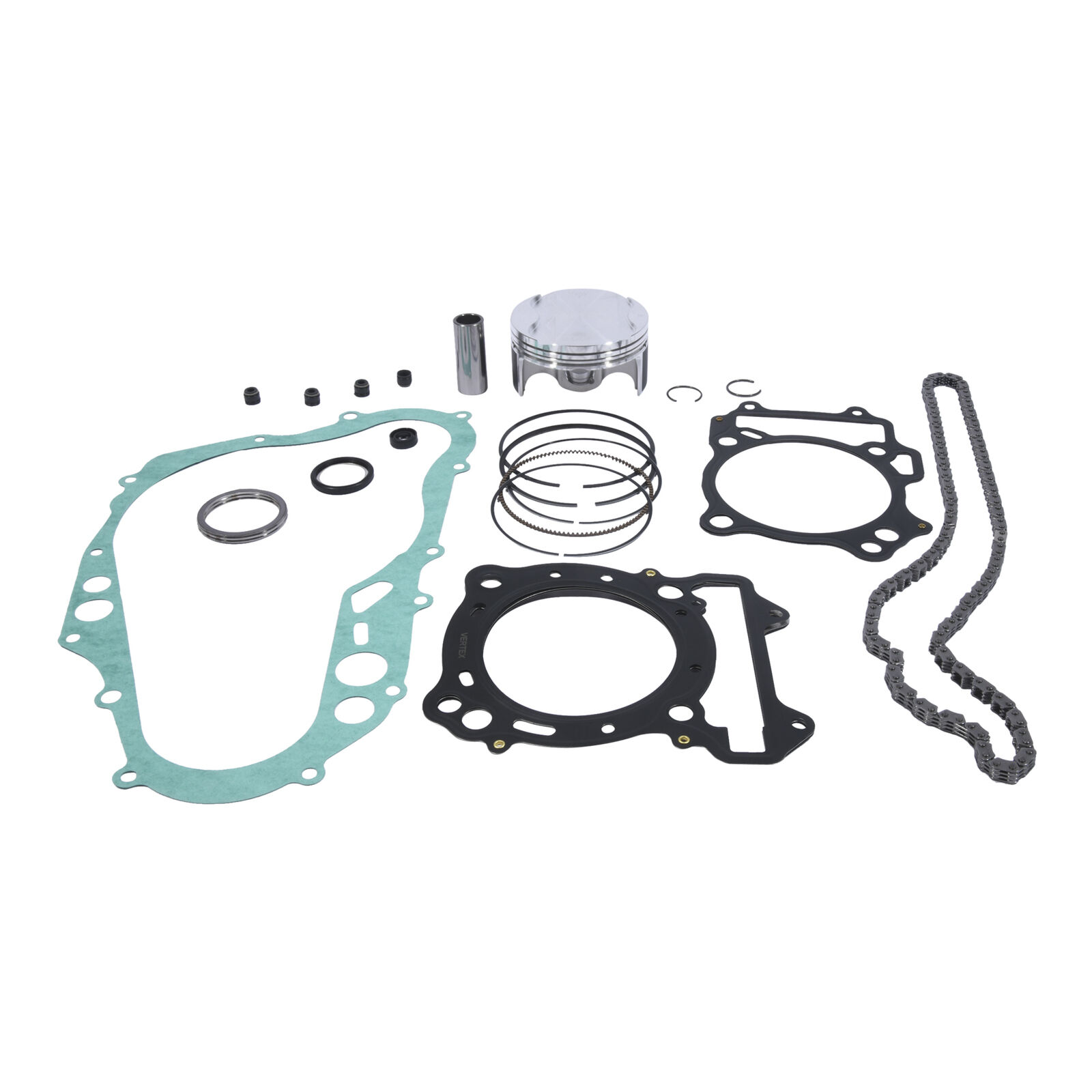 Easing the repair process by saving time and money Vertex Pistons Top-End Piston Kits come with everything needed to replace your piston top-end gaskets and wrist pin bearing (for two-strokes) when the time comes. Included are the piston rings wrist pin circlips top end gaskets and even wrist pin bearing (for two-stroke applications). Four-stroke kits include a free Camchain!